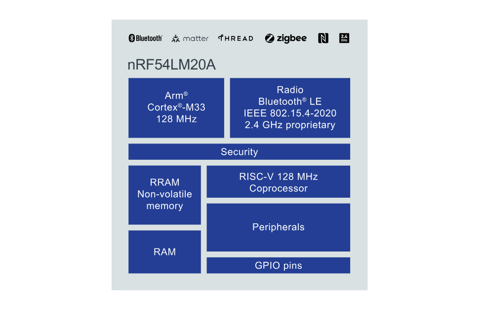 Built on Nordic’s 22 nm technology, the SoC combines a 128 MHz Arm Cortex-M33, a 128 MHz RISC-V coprocessor, and support for up to 66 GPIOs. It integrates 2 MB of non-volatile memory and 512 KB of RAM, enabling developers to design complex Bluetooth LE and Matter-based products without the need for external memory.